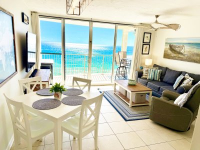 This unit is on the 5th floor on the east side of the building. Being on the corner of the building not only means you have more balcony space but also more of those stunning views!! This condo is very inviting, with great views of the pool, white sandy beaches, the Gulf, and the Pass! It features 3 spacious bedrooms and an open living room and dining area.